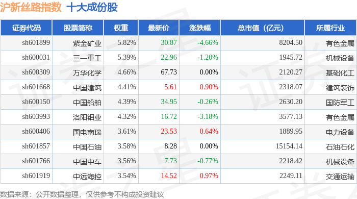 证券之星消息,10月10日,沪新丝路(000160)指数报收于2091.35点,跌0.34%,成交1135.79亿元,换手率1.3%。当日该指数成份股中,上涨的有45家,白银有色以9.96%的涨幅领涨,下跌的有20家,中天科技以7.05%的跌幅领跌。