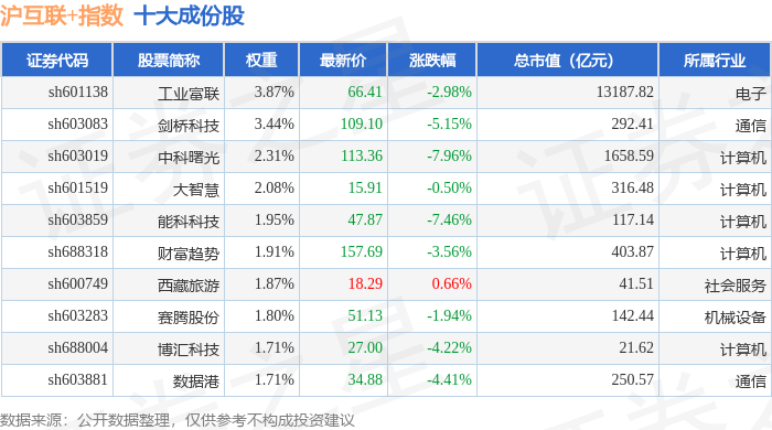证券之星消息,10月10日,沪互联+(000162)指数报收于3713.6点,跌1.94%,成交740.03亿元,换手率1.54%。当日该指数成份股中,上涨的有23家,隆鑫通用以2.78%的涨幅领涨,下跌的有45家,中科曙光以7.96%的跌幅领跌。