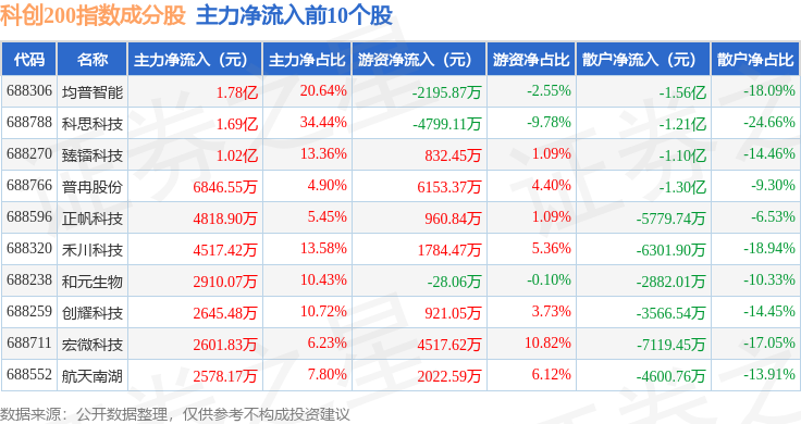 资金流向方面,科创200(000699)指数成份股当日主力资金净流出合计31.57亿元,游资资金净流入合计23.09亿元,散户资金净流入合计8.48亿元。成份股资金流向详情见下表: