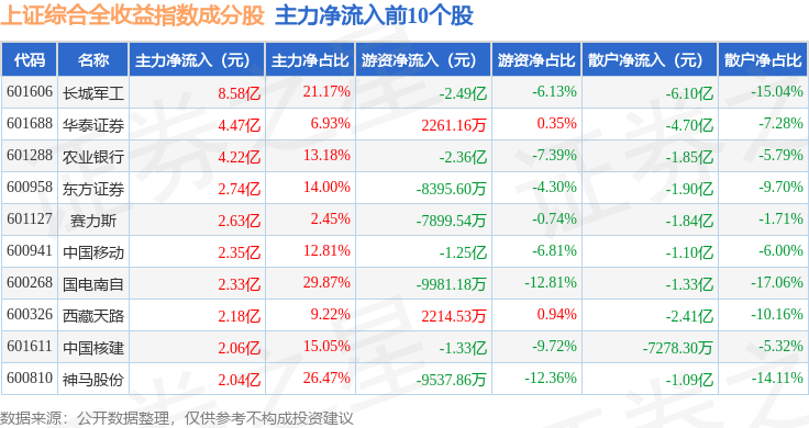 资金流向方面,上证综合全收益(000888)指数成份股当日主力资金净流出合计532.24亿元,游资资金净流入合计206.64亿元,散户资金净流入合计325.6亿元。成份股资金流向详情见下表: