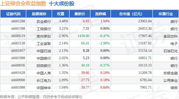 证券之星消息,10月10日,上证综合全收益(000888)指数报收于4443.1点,跌0.94%,成交11321.27亿元,换手率1.52%。当日该指数成份股中,上涨的有1161家,津投城开以10.2%的涨幅领涨,下跌的有1031家,艾罗能源以14.38%的跌幅领跌。
