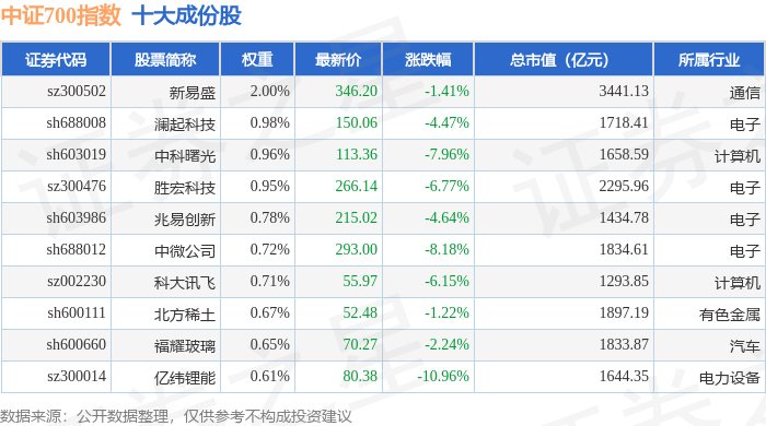 证券之星消息,10月10日,中证700(000907)指数报收于6469.95点,跌2.18%,成交9008.44亿元,换手率2.14%。当日该指数成份股中,上涨的有310家,华新水泥以10.01%的涨幅领涨,下跌的有374家,先导智能以12.89%的跌幅领跌。