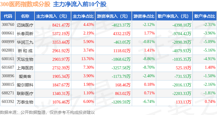 资金流向方面,300医药(000913)指数成份股当日主力资金净流出合计15.06亿元,游资资金净流入合计2.73亿元,散户资金净流入合计12.33亿元。成份股资金流向详情见下表: