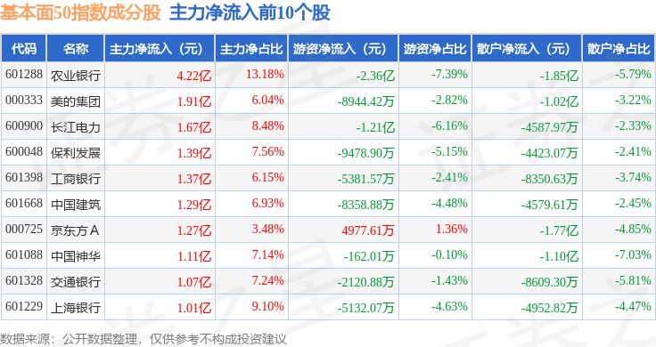 资金流向方面,基本面50(000925)指数成份股当日主力资金净流出合计65.08亿元,游资资金净流入合计26.97亿元,散户资金净流入合计38.11亿元。成份股资金流向详情见下表:
