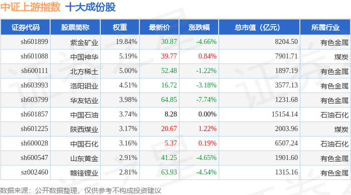 中证上游(000961)指数十大成份股详情如下: