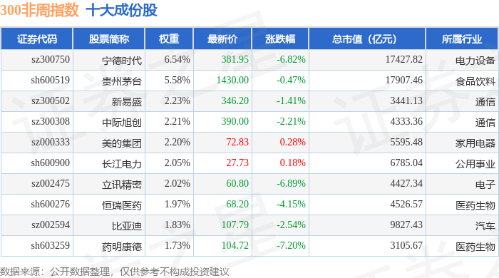 证券之星消息,10月10日,300非周(000969)指数报收于5451.98点,跌2.86%,成交5631.24亿元,换手率1.47%。当日该指数成份股中,上涨的有56家,长春高新以5.45%的涨幅领涨,下跌的有135家,亿纬锂能以10.96%的跌幅领跌。