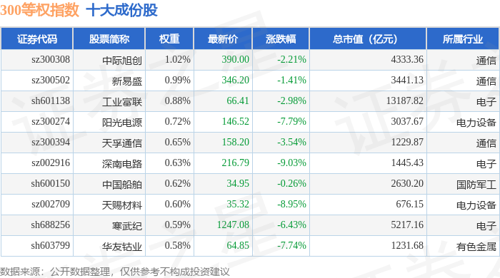 300等权(000984)指数十大成份股详情如下: