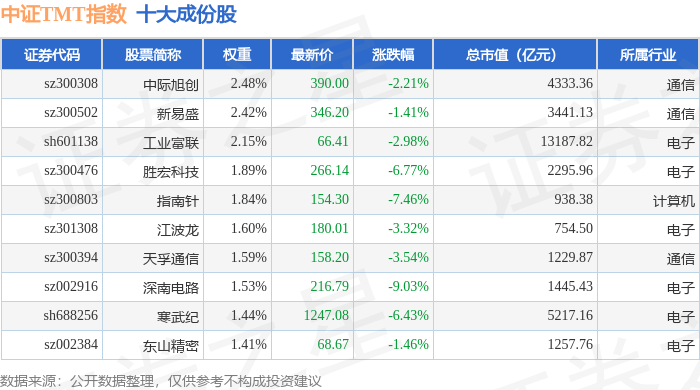 证券之星消息,10月10日,中证TMT(000998)指数报收于2984.92点,跌4.5%,成交4345.64亿元,换手率2.6%。当日该指数成份股中,上涨的有9家,雅克科技以4.7%的涨幅领涨,下跌的有88家,晶合集成以11.03%的跌幅领跌。
