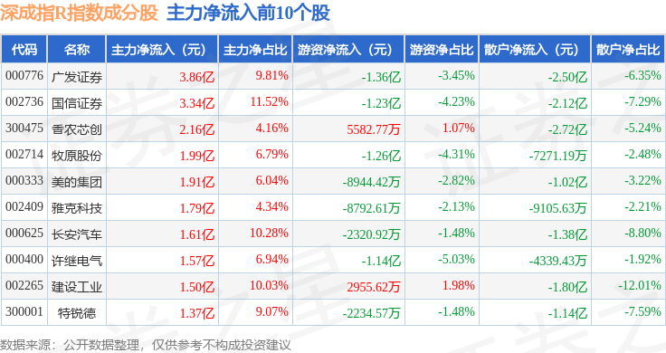 资金流向方面,深成指R(399002)指数成份股当日主力资金净流出合计622.5亿元,游资资金净流入合计190.04亿元,散户资金净流入合计432.46亿元。成份股资金流向详情见下表: