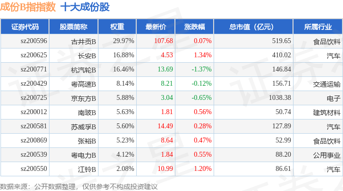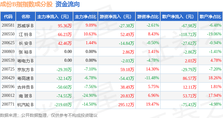 资金流向方面,成份B指(399003)指数成份股当日主力资金净流出合计202.33万元,游资资金净流入合计370.3万元,散户资金净流出合计167.97万元。成份股资金流向详情见下表:
