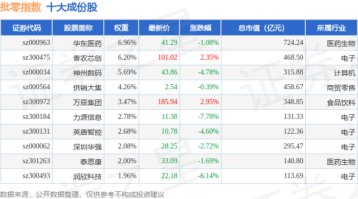 资金流向方面,批零指数(399236)成份股当日主力资金净流出合计10.81亿元,游资资金净流入合计2.37亿元,散户资金净流入合计8.44亿元。成份股资金流向详情见下表: