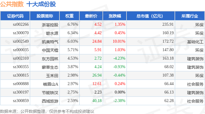证券之星消息,10月10日,公共指数(399244)报收于637.47点,涨1.26%,成交143.09亿元,换手率4.58%。当日该指数成份股中,上涨的有38家,中环环保以19.98%的涨幅领涨,下跌的有11家,东方园林以4.23%的跌幅领跌。