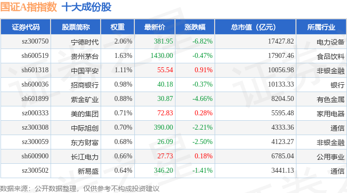 国证A指(399317)指数十大成份股详情如下: