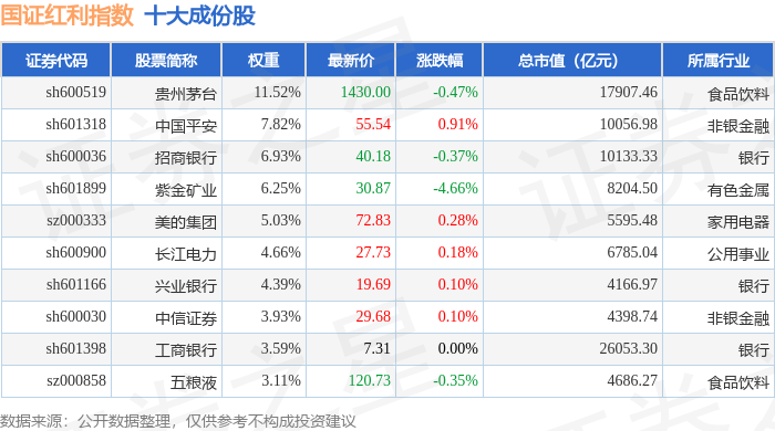 证券之星消息,10月10日,国证红利(399321)指数报收于7488.66点,跌0.13%,成交1056.0亿元,换手率0.45%。当日该指数成份股中,上涨的有33家,兖矿能源以2.86%的涨幅领涨,下跌的有11家,紫金矿业以4.66%的跌幅领跌。