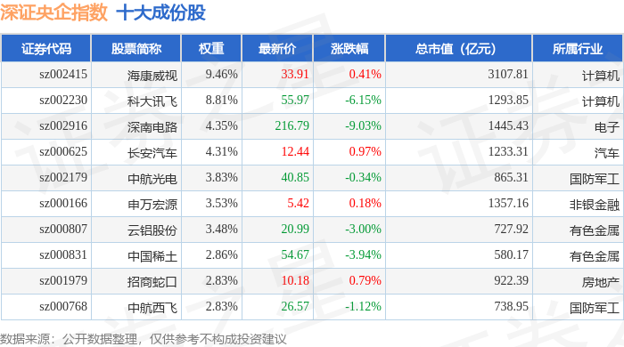 深证央企(399335)指数十大成份股详情如下: