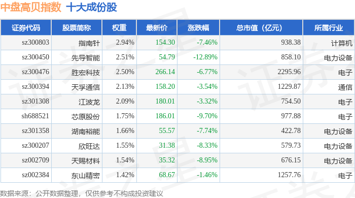 证券之星消息,10月10日,中盘高贝(399407)指数报收于3161.88点,跌4.94%,成交2419.96亿元,换手率3.78%。当日该指数成份股中,上涨的有12家,雅克科技以4.7%的涨幅领涨,下跌的有85家,先导智能以12.89%的跌幅领跌。