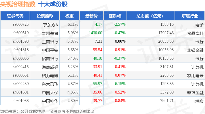 证券之星消息,10月10日,央视治理(399554)指数报收于7508.39点,跌0.67%,成交651.51亿元,换手率0.49%。当日该指数成份股中,上涨的有23家,星宇股份以3.2%的涨幅领涨,下跌的有23家,科大讯飞以6.15%的跌幅领跌。