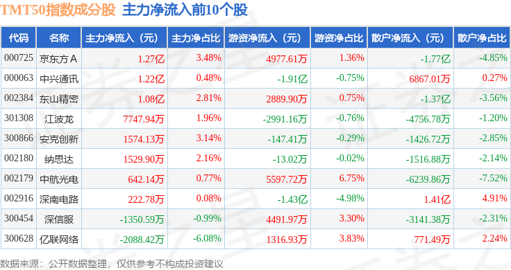 资金流向方面,TMT50(399610)指数成份股当日主力资金净流出合计215.69亿元,游资资金净流入合计62.97亿元,散户资金净流入合计152.72亿元。成份股资金流向详情见下表: