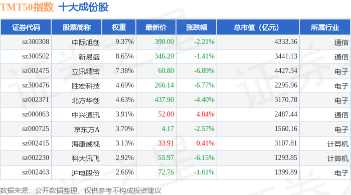 证券之星消息,10月10日,TMT50(399610)指数报收于9265.61点,跌3.84%,成交2449.54亿元,换手率3.61%。当日该指数成份股中,上涨的有3家,中兴通讯以4.04%的涨幅领涨,下跌的有46家,歌尔股份以9.4%的跌幅领跌。