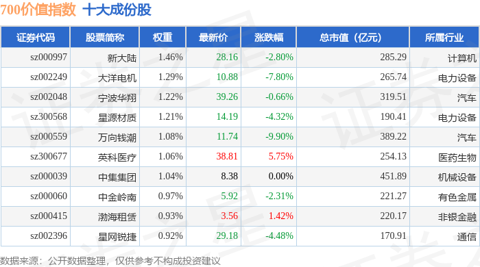 证券之星消息,10月10日,700价值(399629)指数报收于2902.96点,涨0.12%,成交697.01亿元,换手率2.43%。当日该指数成份股中,上涨的有165家,合肥城建以10.04%的涨幅领涨,下跌的有64家,万向钱潮以9.9%的跌幅领跌。