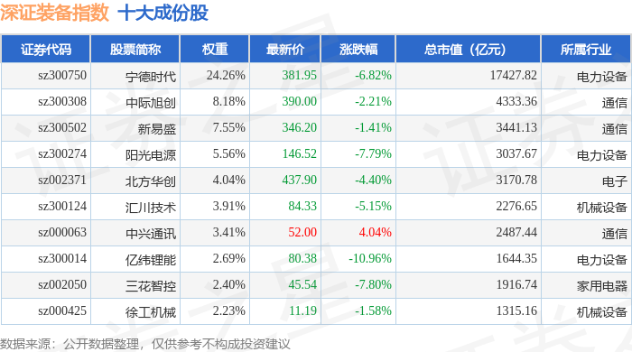 证券之星消息,10月10日,深证装备(399636)指数报收于7608.52点,跌4.21%,成交2311.85亿元,换手率4.18%。当日该指数成份股中,上涨的有16家,建设工业以5.7%的涨幅领涨,下跌的有63家,先导智能以12.89%的跌幅领跌。