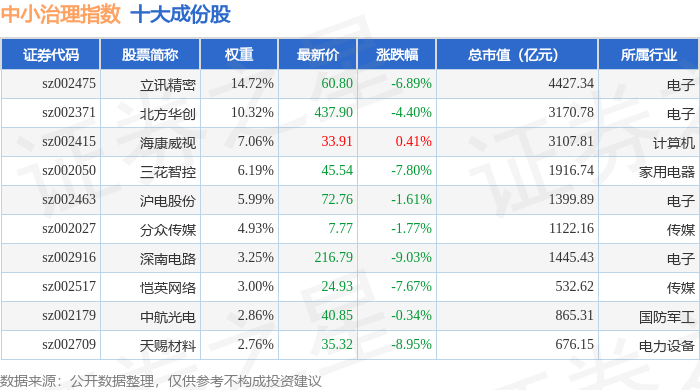 证券之星消息,10月10日,中小治理(399650)指数报收于2656.82点,跌3.49%,成交757.59亿元,换手率2.03%。当日该指数成份股中,上涨的有26家,兔宝宝以4.83%的涨幅领涨,下跌的有23家,深南电路以9.03%的跌幅领跌。