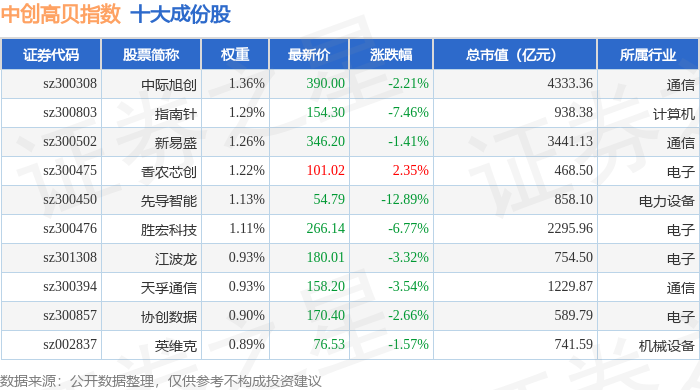 证券之星消息,10月10日,中创高贝(399666)指数报收于1997.36点,跌3.58%,成交3716.18亿元,换手率4.89%。当日该指数成份股中,上涨的有35家,新莱应材以20.0%的涨幅领涨,下跌的有164家,上能电气以13.72%的跌幅领跌。