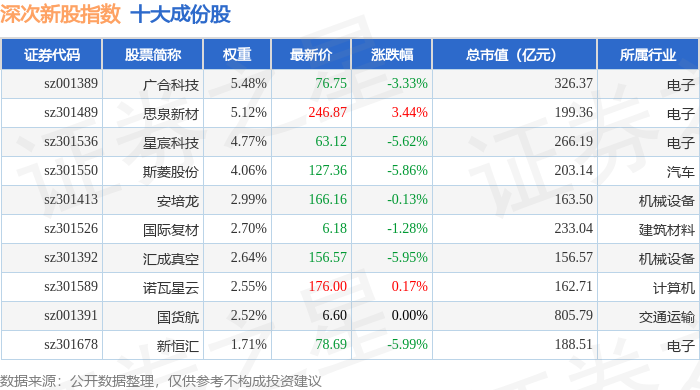 证券之星消息,10月10日,深次新股(399678)指数报收于600.57点,跌1.72%,成交168.71亿元,换手率4.41%。当日该指数成份股中,上涨的有34家,悍高集团以5.34%的涨幅领涨,下跌的有65家,宏工科技以9.57%的跌幅领跌。