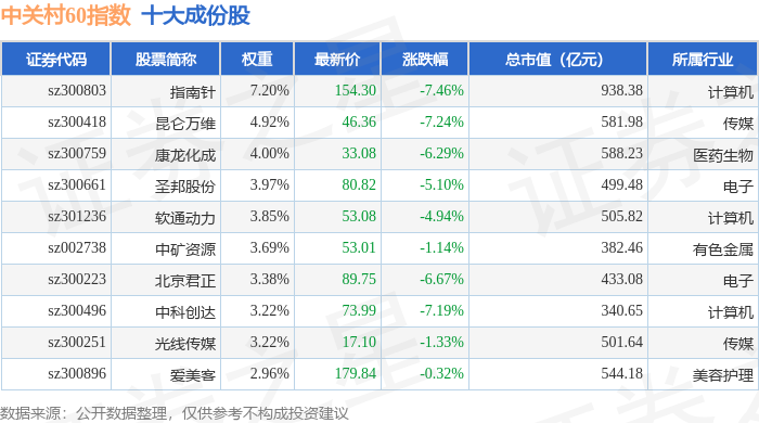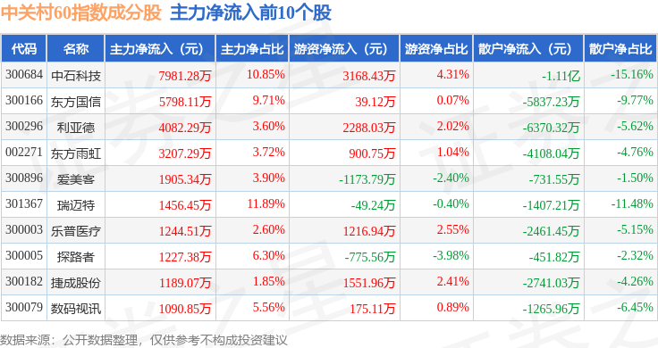 资金流向方面,中关村60(399697)指数成份股当日主力资金净流出合计49.11亿元,游资资金净流入合计20.56亿元,散户资金净流入合计28.55亿元。成份股资金流向详情见下表: