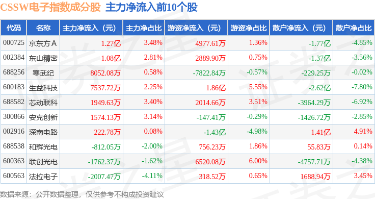 资金流向方面,CSSW电子(399811)指数成份股当日主力资金净流出合计234.6亿元,游资资金净流入合计102.95亿元,散户资金净流入合计131.65亿元。成份股资金流向详情见下表: