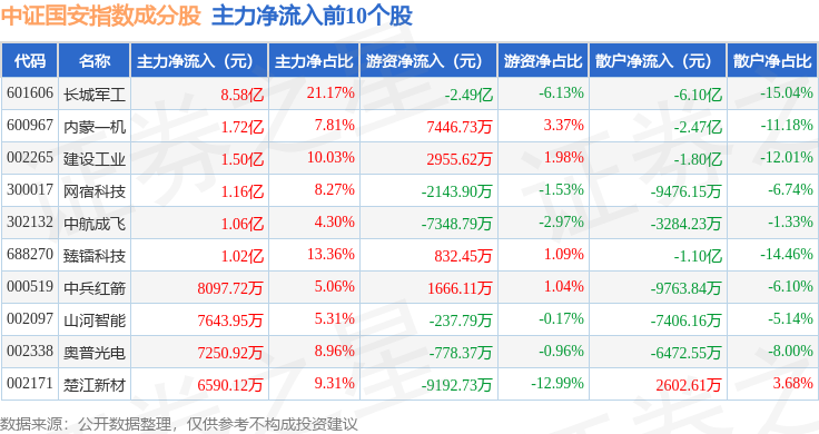 资金流向方面,中证国安(399813)指数成份股当日主力资金净流出合计76.11亿元,游资资金净流入合计24.0亿元,散户资金净流入合计52.11亿元。成份股资金流向详情见下表: