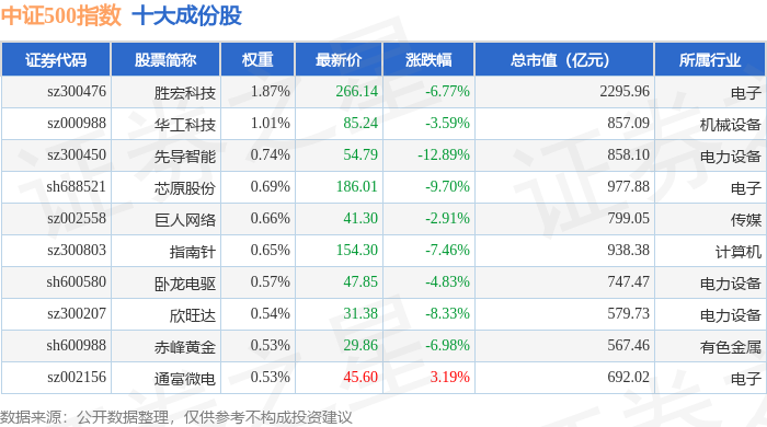 证券之星消息,10月10日,中证500(399905)指数报收于7398.22点,跌2.0%,成交5021.27亿元,换手率2.32%。当日该指数成份股中,上涨的有239家,华新水泥以10.01%的涨幅领涨,下跌的有250家,先导智能以12.89%的跌幅领跌。