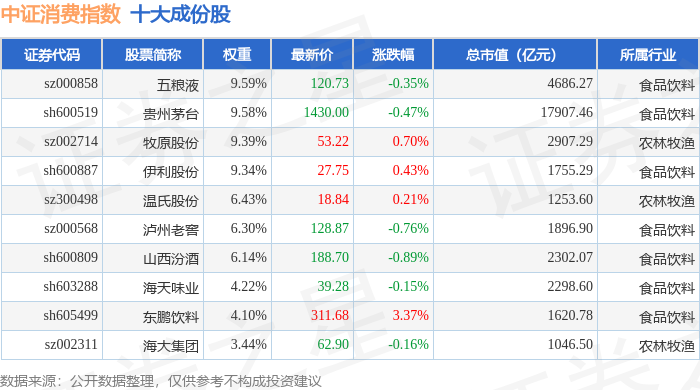 证券之星消息,10月10日,中证消费(399932)指数报收于16436.95点,涨0.31%,成交262.26亿元,换手率0.93%。当日该指数成份股中,上涨的有27家,养元饮品以10.0%的涨幅领涨,下跌的有13家,古井贡酒以1.04%的跌幅领跌。