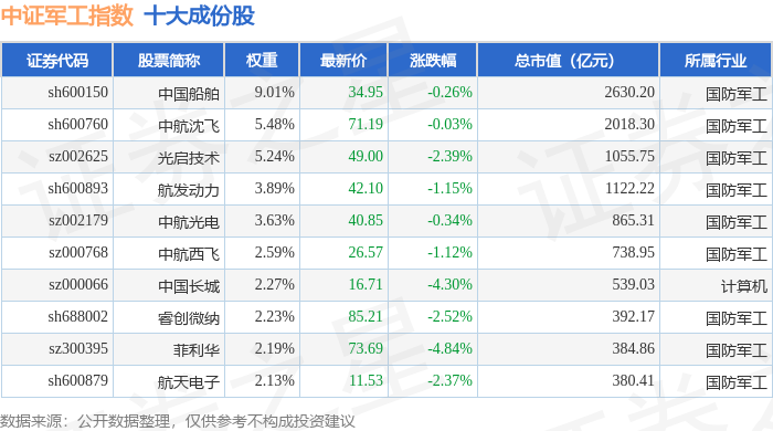 证券之星消息,10月10日,中证军工(399967)指数报收于12597.67点,跌1.14%,成交613.06亿元,换手率2.3%。当日该指数成份股中,上涨的有19家,长城军工以10.0%的涨幅领涨,下跌的有60家,图南股份以8.49%的跌幅领跌。