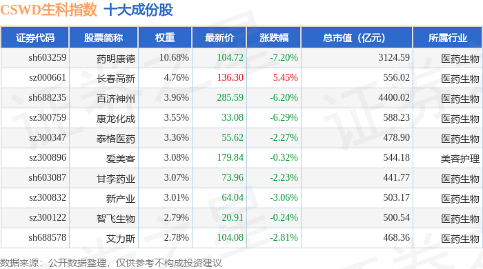 证券之星消息,10月10日,CSWD生科(399993)指数报收于2923.02点,跌2.01%,成交290.32亿元,换手率1.59%。当日该指数成份股中,上涨的有29家,长春高新以5.45%的涨幅领涨,下跌的有69家,药明康德以7.2%的跌幅领跌。