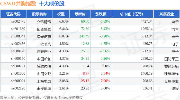 证券之星消息,10月10日,CSWD并购(399992)指数报收于2133.35点,跌2.24%,成交765.51亿元,换手率2.25%。当日该指数成份股中,上涨的有47家,津投城开以10.2%的涨幅领涨,下跌的有48家,万向钱潮以9.9%的跌幅领跌。