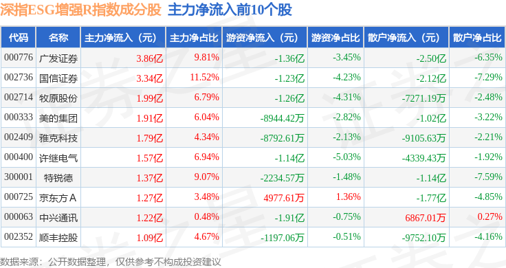 资金流向方面,深指ESG增强R(470032)指数成份股当日主力资金净流出合计375.96亿元,游资资金净流入合计119.57亿元,散户资金净流入合计256.39亿元。成份股资金流向详情见下表: