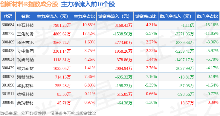 资金流向方面,创新材料R(470039)指数成份股当日主力资金净流出合计68.51亿元,游资资金净流入合计21.0亿元,散户资金净流入合计47.51亿元。成份股资金流向详情见下表: