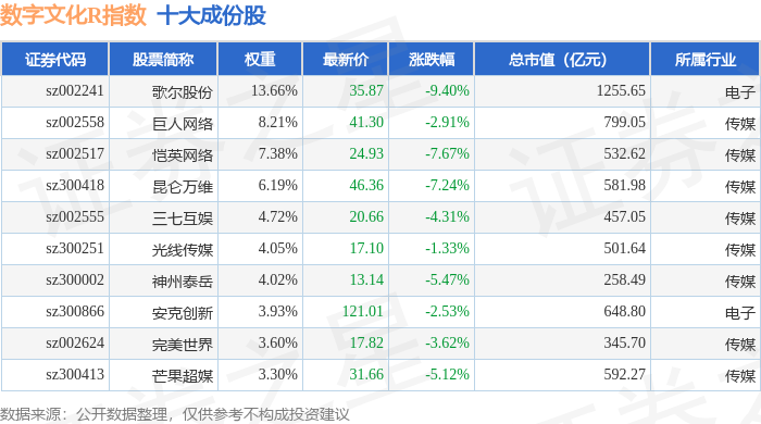 证券之星消息,10月10日,数字文化R(470047)指数报收于1256.81点,跌3.86%,成交398.98亿元,换手率4.09%。当日该指数成份股中,上涨的有9家,名臣健康以9.98%的涨幅领涨,下跌的有41家,歌尔股份以9.4%的跌幅领跌。