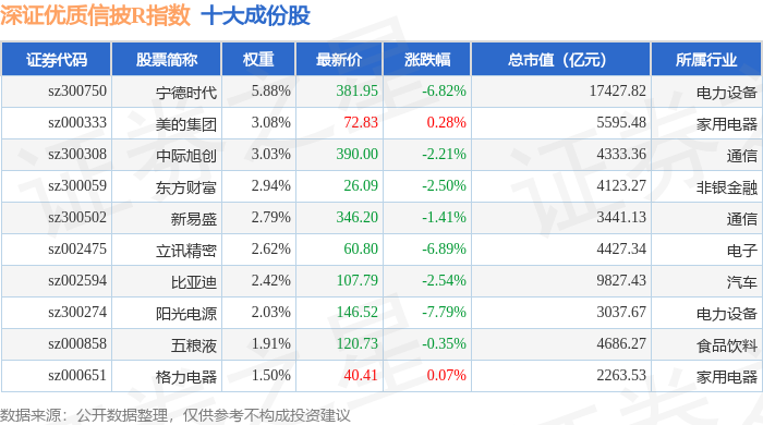 证券之星消息,10月10日,深证优质信披R(470065)指数报收于3675.02点,跌2.58%,成交5990.81亿元,换手率2.66%。当日该指数成份股中,上涨的有235家,合肥城建以10.04%的涨幅领涨,下跌的有247家,先导智能以12.89%的跌幅领跌。