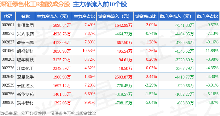 资金流向方面,深证绿色化工R(470076)指数成份股当日主力资金净流出合计55.58亿元,游资资金净流入合计18.11亿元,散户资金净流入合计37.48亿元。成份股资金流向详情见下表: