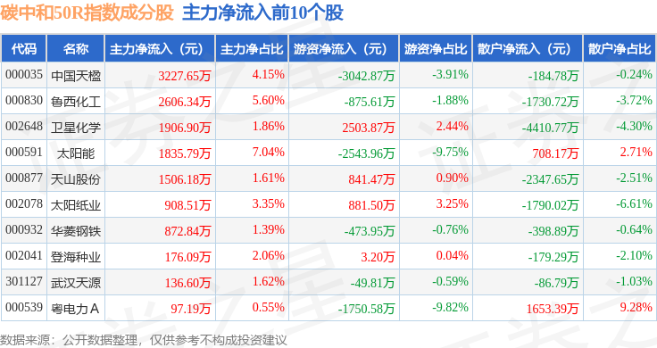 资金流向方面,碳中和50R(480021)指数成份股当日主力资金净流出合计95.57亿元,游资资金净流入合计33.86亿元,散户资金净流入合计61.72亿元。成份股资金流向详情见下表: