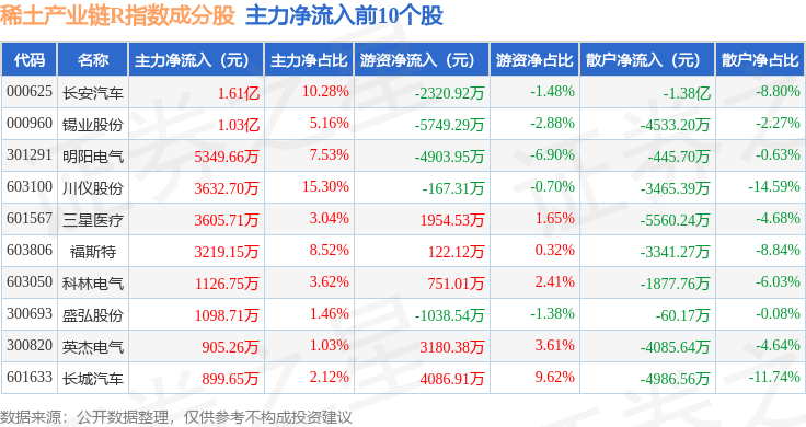 资金流向方面,稀土产业链R(489013)指数成份股当日主力资金净流出合计164.03亿元,游资资金净流入合计68.82亿元,散户资金净流入合计95.21亿元。成份股资金流向详情见下表: