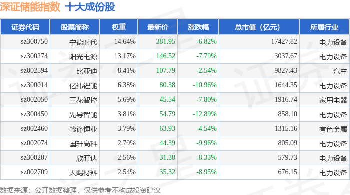 资金流向方面,深证储能(970036)指数成份股当日主力资金净流出合计213.21亿元,游资资金净流入合计63.4亿元,散户资金净流入合计149.81亿元。成份股资金流向详情见下表: