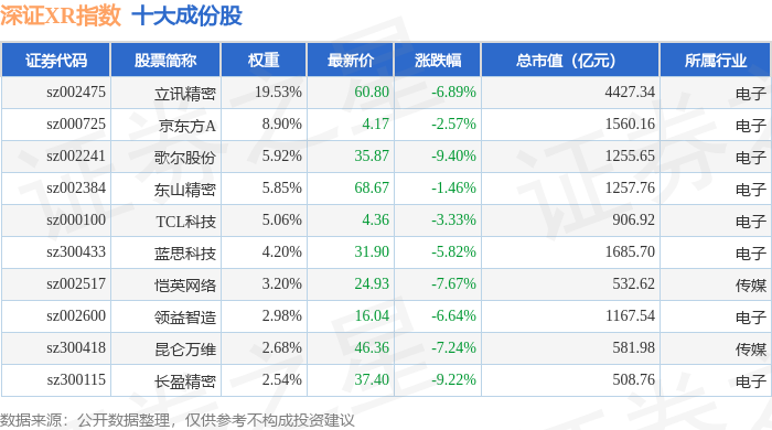 证券之星消息,10月10日,深证XR(970046)指数报收于2307.02点,跌4.99%,成交990.4亿元,换手率3.97%。当日该指数成份股中,上涨的有5家,创维数字以3.39%的涨幅领涨,下跌的有44家,歌尔股份以9.4%的跌幅领跌。