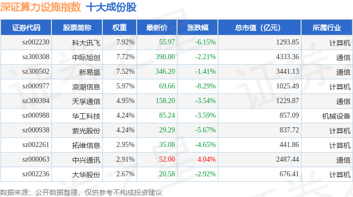 证券之星消息,10月10日,深证算力设施(970051)指数报收于11406.33点,跌4.01%,成交1479.5亿元,换手率5.42%。当日该指数成份股中,上涨的有5家,先进数通以9.61%的涨幅领涨,下跌的有45家,浪潮信息以8.29%的跌幅领跌。
