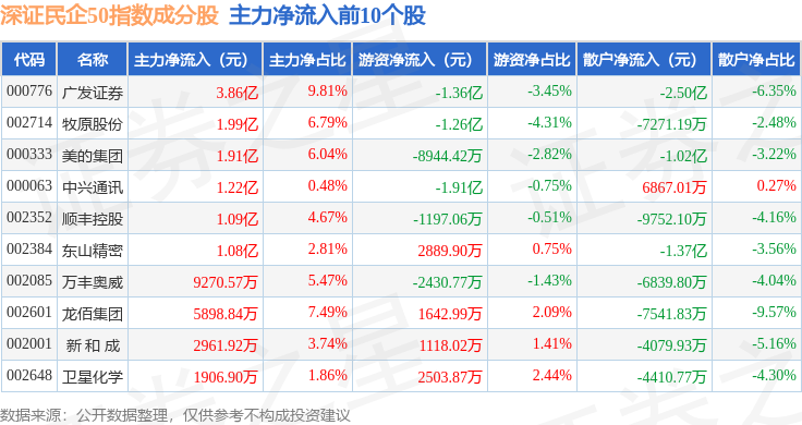 资金流向方面,深证民企50(970057)指数成份股当日主力资金净流出合计204.32亿元,游资资金净流入合计68.78亿元,散户资金净流入合计135.55亿元。成份股资金流向详情见下表:
