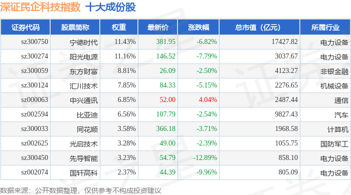 证券之星消息,10月10日,深证民企科技(970059)指数报收于5393.36点,跌4.06%,成交1575.98亿元,换手率4.35%。当日该指数成份股中,上涨的有7家,中兴通讯以4.04%的涨幅领涨,下跌的有43家,先导智能以12.89%的跌幅领跌。