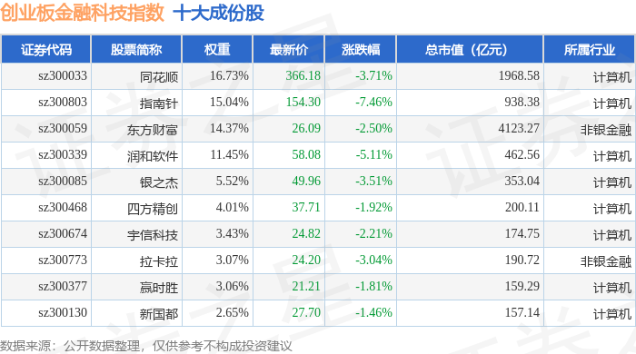 创业板金融科技(970085)指数十大成份股详情如下: