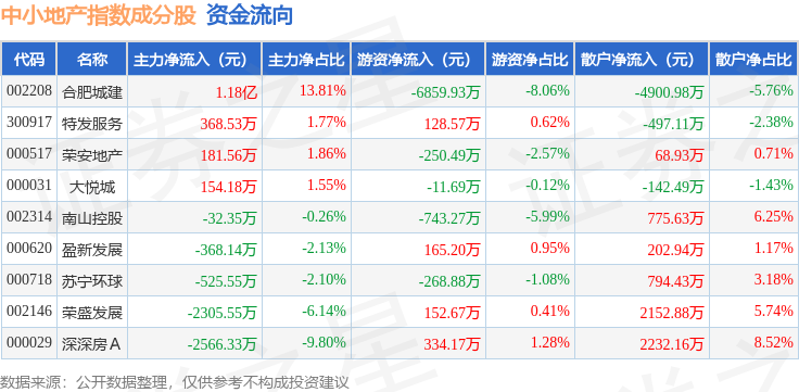 资金流向方面,中小地产(971002)指数成份股当日主力资金净流入合计6667.27万元,游资资金净流出合计7353.65万元,散户资金净流入合计686.39万元。成份股资金流向详情见下表: